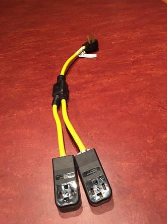 NEMA 14-30 Y-adapter splits the outlet commonly used for newer dryers. Two 14-30 female connectors enable two devices to be plugged in at the same time from the outlet. $40