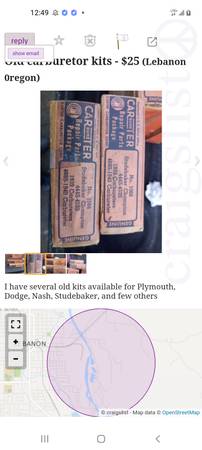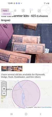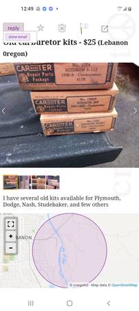 I have apoximatly 60 rebuild kits available. Plymouth, Dodge, Chrysler, Hudson, willys, Chevrolet, Oldsmobile, Buick and a few others. If interested text . NO CALLS TEXT ONLY.