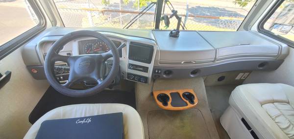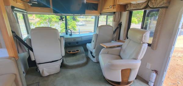 Inside and out you'll be pampered by this luxurious motor home, and you'll love such features as leather seating in the cab area and a backup camera system with side view cameras which makes traveling easy and comfy. A sofa sleeper is perfect for the long hauls for guests, complete with seat belts for safety. You'll feel right at home with the plush swivel chair and additional table perfect for a laptop or work area.