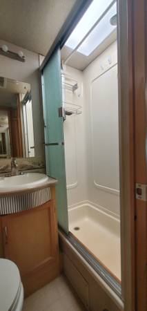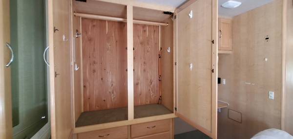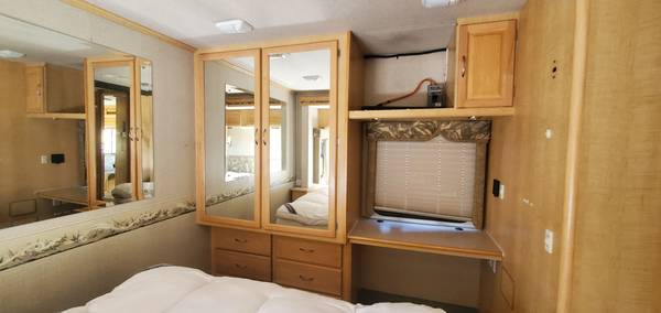 You'll get a good night's rest in the private bedroom suite You'll sleep like royalty in the Island Queen Bed with night stands on both sides of the bed including USBs and 110 outlets for all your devices. There's plenty of room for a complete wardrobe in the large lighted cedar lined closet with tons of spacious drawers, and a computer station area that sits across from the bed complete with TV above. The bathroom is a spacious all-in-one featuring a glass surround shower, medicine cabinet, porcelain commode and even a hair dryer round off this spacious area conveniently located just beside the bedroom.