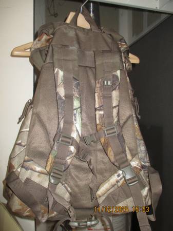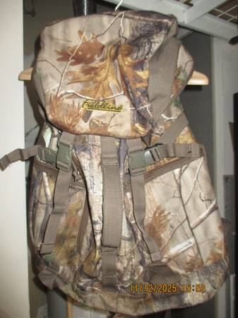Fieldline Realtree camo backpack. A large main compartment and several smaller storage pockets. All zipper enclosed. Padded shoulder and waist straps all snapped together, no velcro. 24" long by 18"...