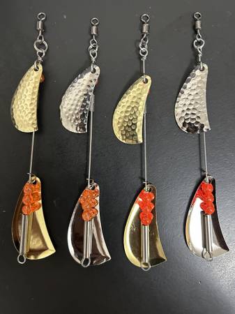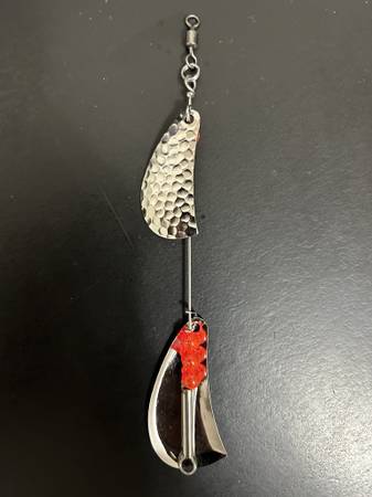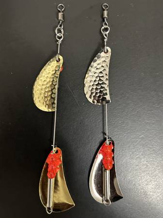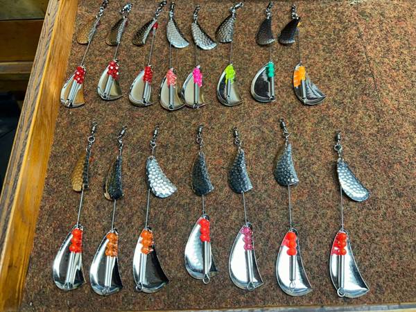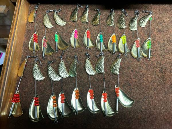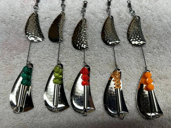Hand made #5 Doc Shelton Spinner clones, Hammered Nickel, Hammered Brass and Smooth nickel. Over 100 sold. Many bead color options just ask! We used these in the 60's and 70's than they quit making them. Lures, Spinners, Trolling. Trout, Blueback, Steelhead, Kokanee, Fishing, Rivers and Lakes. $5.50 each. Shipping available .