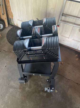 Pro Lock Pro Series Dumbells. 85 lb with 90 lb expansions. Rolling rack. Excellent condition.