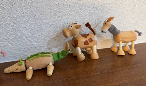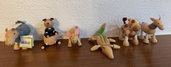Set of 6 ANAMALZ animals - Rhino, Panda, Pig, Crocodile, Cow, Donkey. The legs are repositional. Part fabric, part wood. Australian designed. Made in China. Great for creative play.