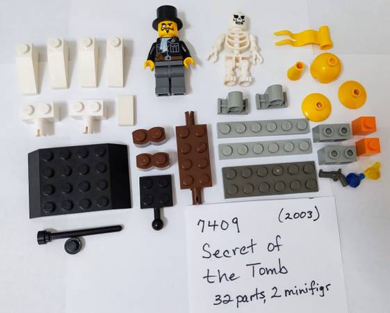 Lego Orient Expedition Adventures set: 7409 Secret of the Tomb (2003) contains 32 parts and 2 minifigures (Lord Sam Sinister & Skeleton). All parts included, except for original box and...
