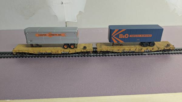 Walthers Trainline HO TTX #90117 Piggyback flat cars with truck trailers. Custom weathered. Asking $30 for both or $20 for both without the trailers. Also interested in trades for Santa Fe and...