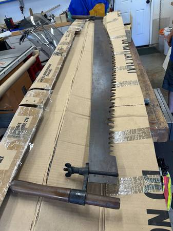 Vintage 60" Two-Man King Steel Crosscut Saw with handles.