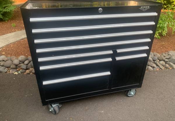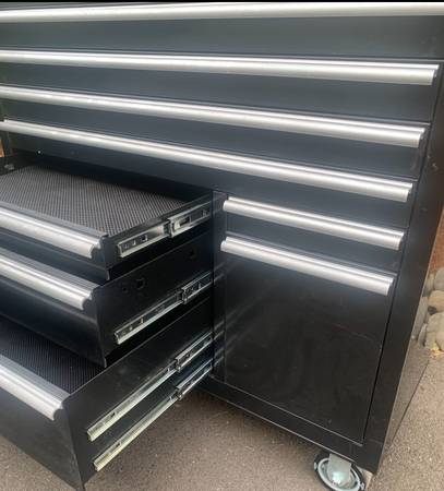 40 1/4 floor to top of workbench height 2 swivel wheels with wheel brakes. 2 fixed wheels 2 keys for the lock All drawers have a drawer liner (removable) in them Ball bearing slides 4 full width...