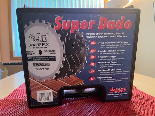 Freud 6"Super Dado set model SD506 in very good condition. Purchased new a number of years ago and only used occasionally. Set includes 2 blades, 6 chippers and shim set. Adjusts in .004" or 1/250" increments. Ideal For: For cutting slots, grooves, dadoes, and rabbets in softwood or hardwood.