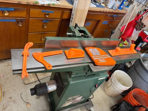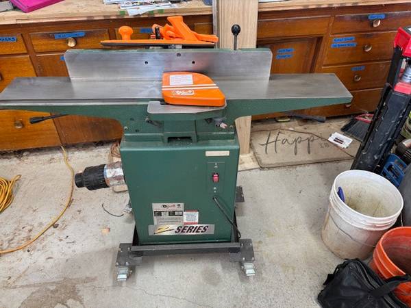 Grizzly jointer in excellent condition. Spiral/helical cutting head. On casters. Model G1182Z. 120 V.