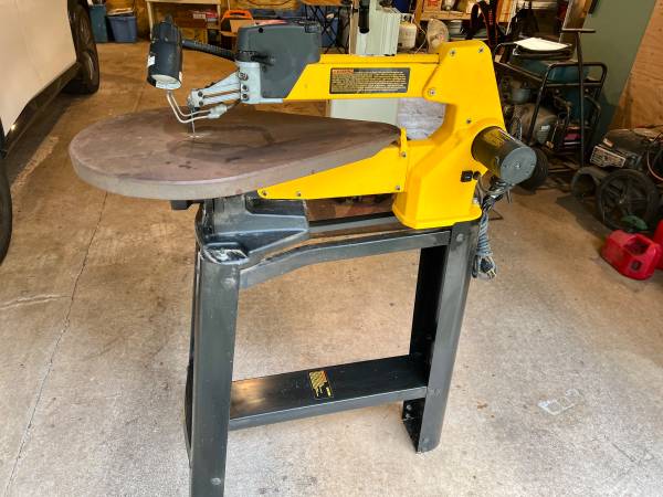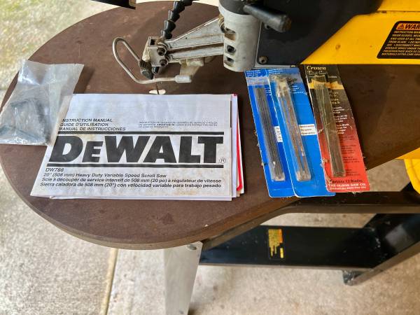 DeWalt Model DW788 scroll saw and stand with light and air jet (to keep work area clear of sawdust). Offer includes instruction book and spare saw blades. Saw is 49" tall with stand. Cash only