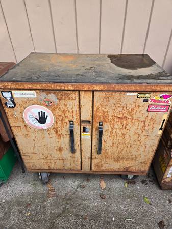 Double door knaack box with drawers. Rough condition, but doors still latch drawers work. Lower drawer needs new sliders (are included) 1 wheel doesn't spin