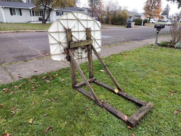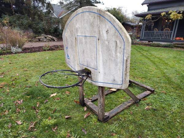 Basketball hoop mounted on a frame for the shortest imaginable player. The hoop needs a net obviously but it's in fine condition and ready to mount on your garage. Or use it as is; you do you.