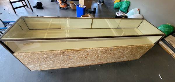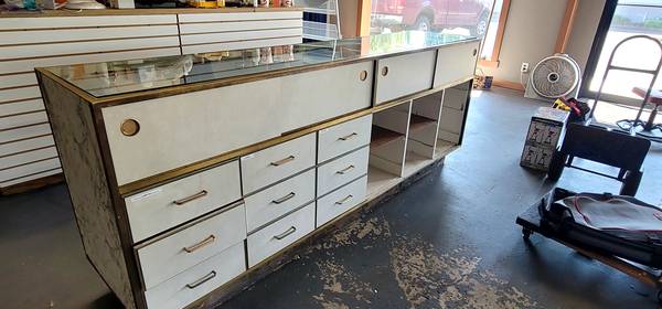 Granite front Glass display case. We used it in our comic shop but have closed down the shop and this needs to go ASAP. It has the display case portion on top and on the bottom portion in the back it has 9 drawers and 5 cubby sections for storage. It is heavy. The front has 2 slabs of granite that can be removed, but that would have to be done on your own.