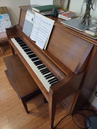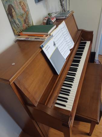 I have a nice upright piano with a good solid sound. I play on it every day, but I am moving to a location that doesn't have room for a piano and frankly it's not worth the hassle to find some place to store it. I am offering it for free, you just need to be able to move it. It is heavy, probably 500 pounds or so.